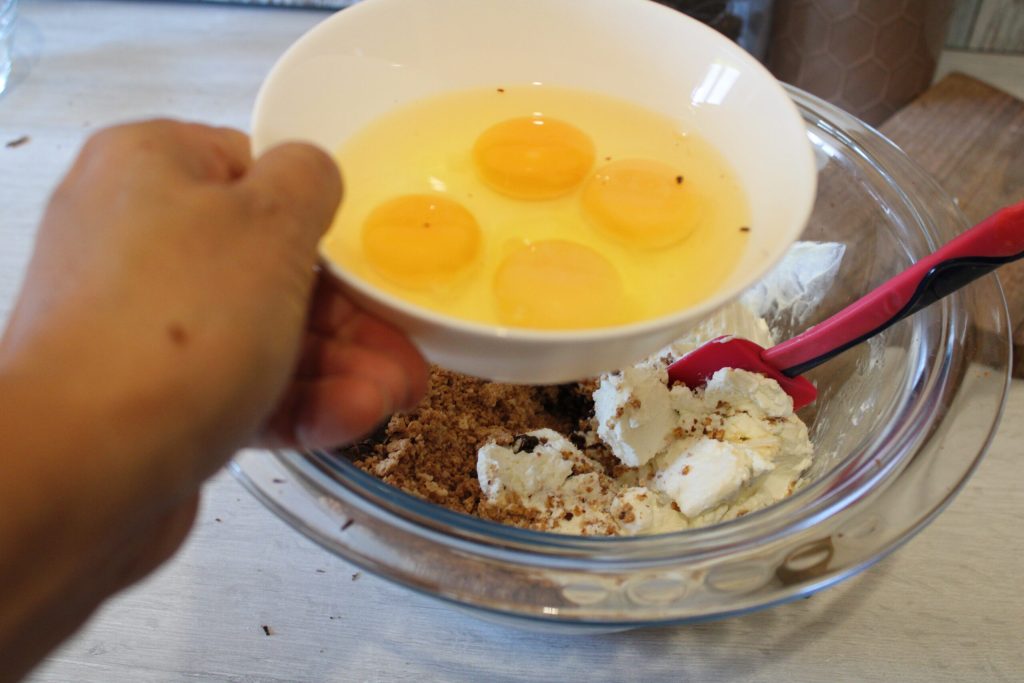Nadat je de amaretti hebt fijngestampt, voeg je ook de ricotta, suiker, geraspte chocolade en rum toe.
