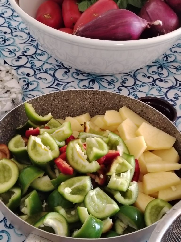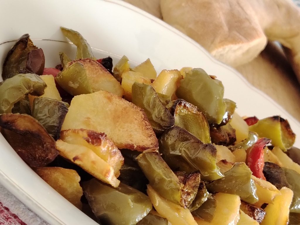 Giet een beetje olijfolie in een pan, en zodra het warm is voeg je de groenten toe; ze moeten frituren zonder te drijven in de olie, om dan een knapperig korstje aan de randen van de paprika’s en een gouden kleur aan de aardappelen te krijgen. Zout aan het einde van het koken en serveer met semolina brood!