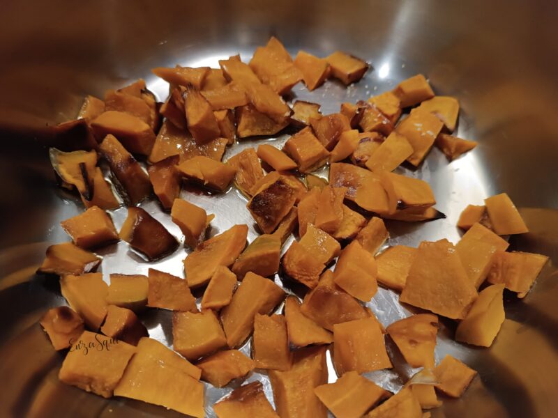 Snijd de pompoen in stukjes nadat je hem hebt geschild en bak hem ongeveer dertig minuten in de oven, voeg olie, zout, rozemarijn en sesam toe
