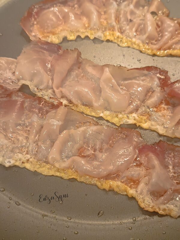 Bak de plakjes spek in een koekenpan met heel weinig olie…
