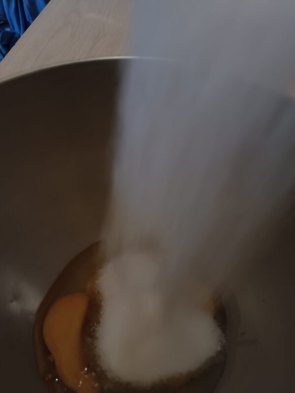 Giet de suiker en de eieren in de kom van de keukenmachine of in een andere kom