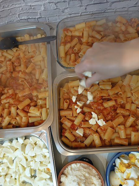 Kook ondertussen de pasta in gezouten water en laat deze zeer al dente, en de eieren; bereid de ovenschaal en de in blokjes gesneden mozzarella voor. Meng de rigatoni met je rijke vleessaus, na het afgieten en plaats de helft in de ovenschaal, voeg de eieren, de mozzarella en een snufje grana toe