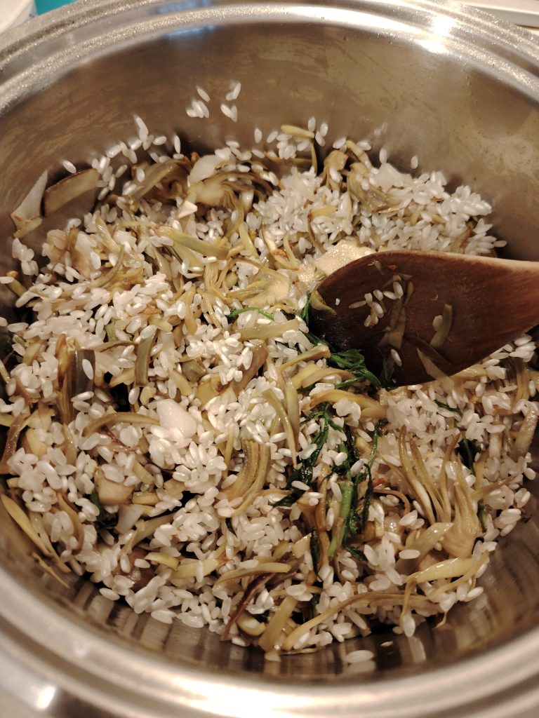 Risotto met artisjokken en saffraan. Ik heb er maar liefst zes artisjokken geoogst in mijn kleine moestuin, een groot genoegen gezien de omvang van de plant.