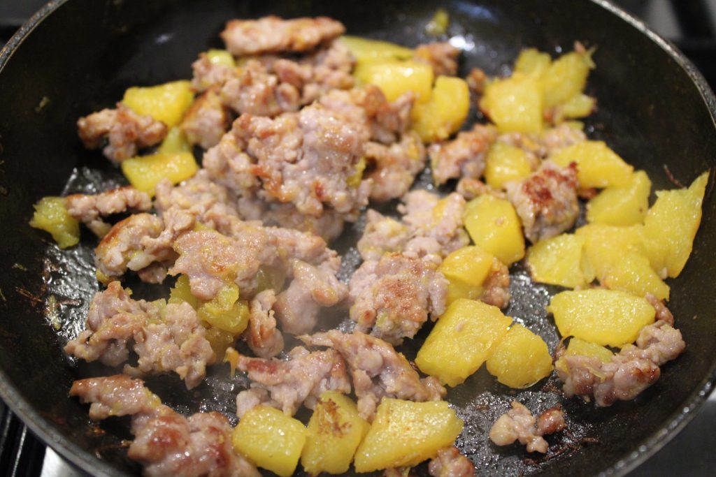 • Braad de worst zonder het buitenste vel aan, voeg pompoenstukjes toe en voeg ten slotte de rijst toe. Laat langzaam koken door beetje bij beetje hete groentebouillon toe te voegen.