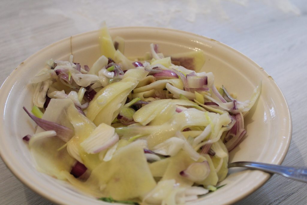 Snijd ondertussen de aardappelen en uien in zeer dunne plakjes, zoals chips, plaats in het vergiet en bestrooi met zout om het plantvocht te verwijderen. Het zal ongeveer twee uur duren voor een goed resultaat. Spoel af met koud water en voeg de kruiden en een scheutje olie toe.