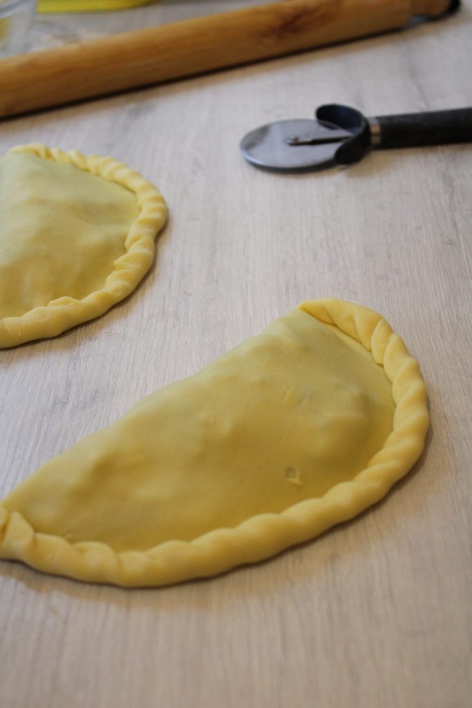 Nu kun je het deeg uitrollen en cirkels van 20 cm in diameter vormen, vul met de uien en aardappelen