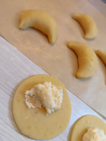 • Verdeel de vulling en sluit de schijfjes tot een halve maan, geef dan nog een extra vouw om een soort schelp te vormen