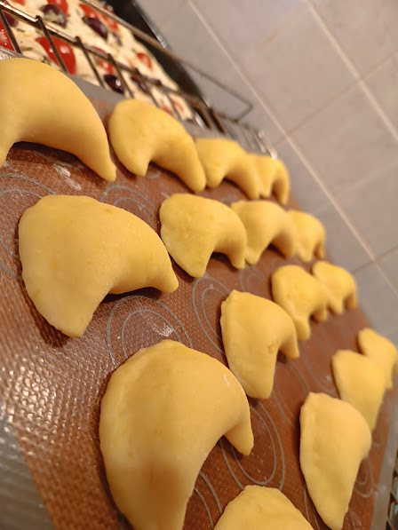• Kneed op dit punt het deeg, en na het ongeveer dertig minuten te hebben laten rusten, rol het uit en snijd de schijfjes met een koekjesvorm van ongeveer 8 cm diameter, tot het deeg op is.