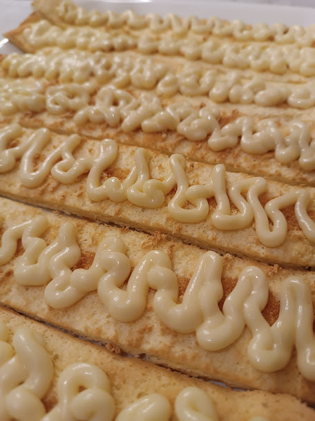 Snijd je biscuit in gelijke reepjes en giet er de karamel overheen, ik heb ervoor gekozen om de vulling in het midden te doen…