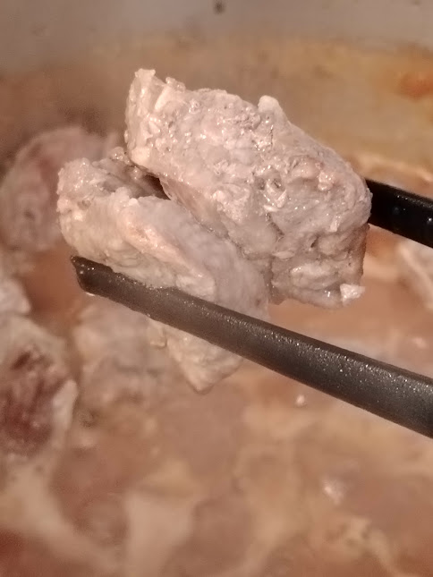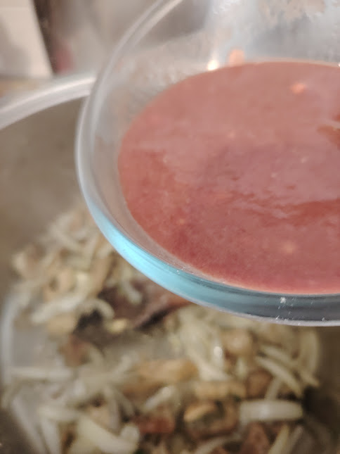 • Voeg het eerder gebraden vlees toe en laat langzaam koken. Voeg indien nodig een beetje warm water of groentebouillon toe om de saus niet te veel te laten indikken, zodat het vloeibaar blijft; breng tegen het einde van de kooktijd op smaak met zout
