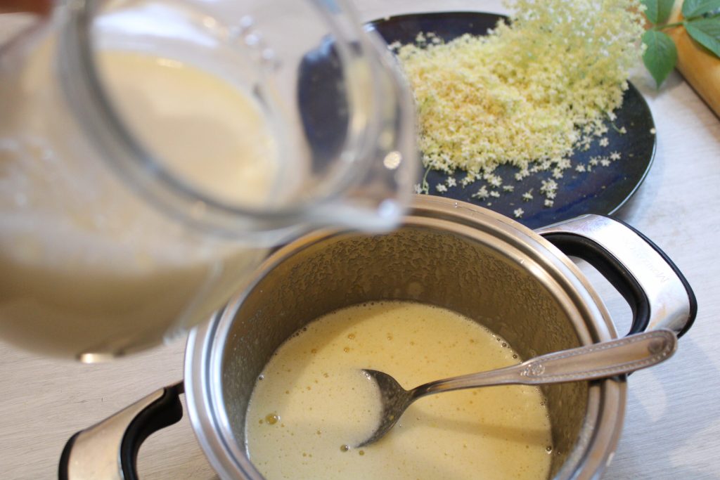 Zodra het klaar is, voeg de eerder voorbereide vlierbloesem toe.