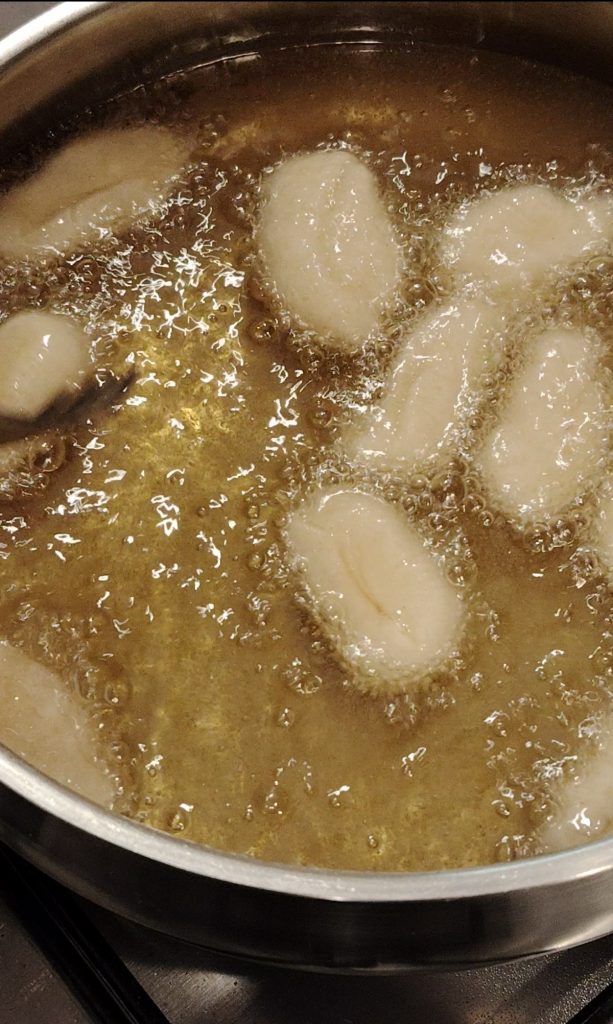 Frituur in hete olie en laat uitlekken om overtollig vet kwijt te raken.