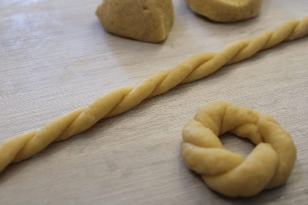 En maak je torcetti. Nadat het deeg klaar is, rol de bovenkant in kristalsuiker.