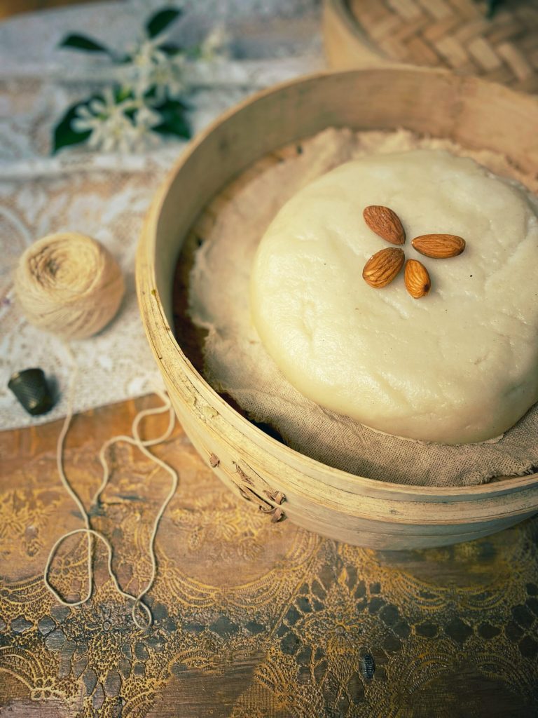 Maak een soort ronde cake, met behulp van een taartring, plaats in de stoompan, dek af met een doek, strijk het oppervlak glad en stoom gedurende 25 minuten.