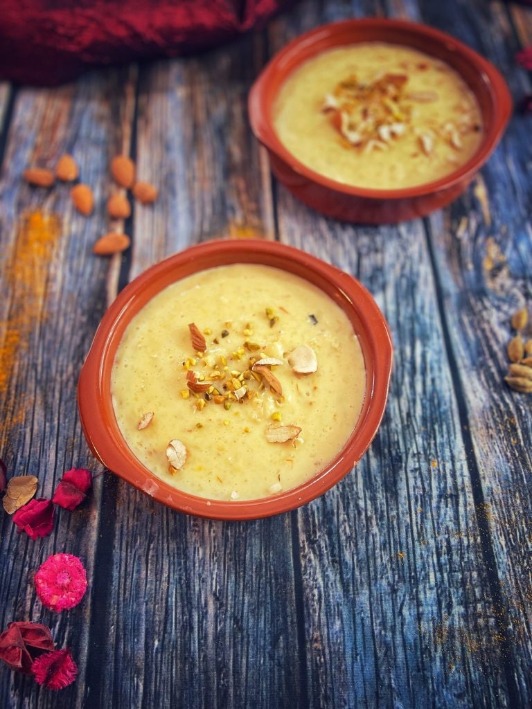 Het is gesuikerde volle melk, langzaam ingekookt tot een romige textuur, verrijkt met aromatische specerijen zoals kardemom en saffraan, en gegarneerd met gedroogd fruit.