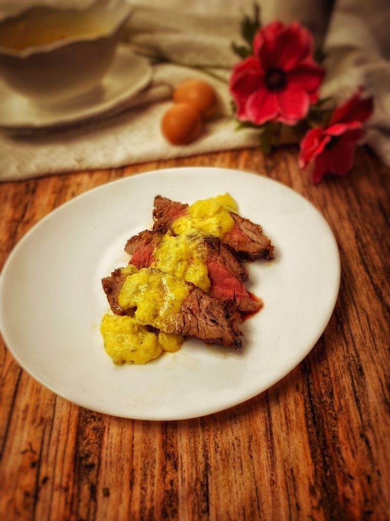 Snijd en serveer met béarnaisesaus erover of apart.