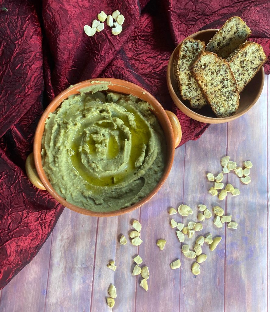 Doe de bonen in een pan, voeg het water, de olijfolie, de geperste knoflook en de specerijen toe, kook minstens 35 minuten en pureer, voeg het citroensap en zout toe, garneer met olijfolie en serveer met sneetjes brood.