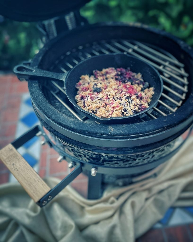 Mijn Blauwe fruit crisp is gemaakt met bosbessen en frambozen, op de kamado en geserveerd met vegan smurfenijs.