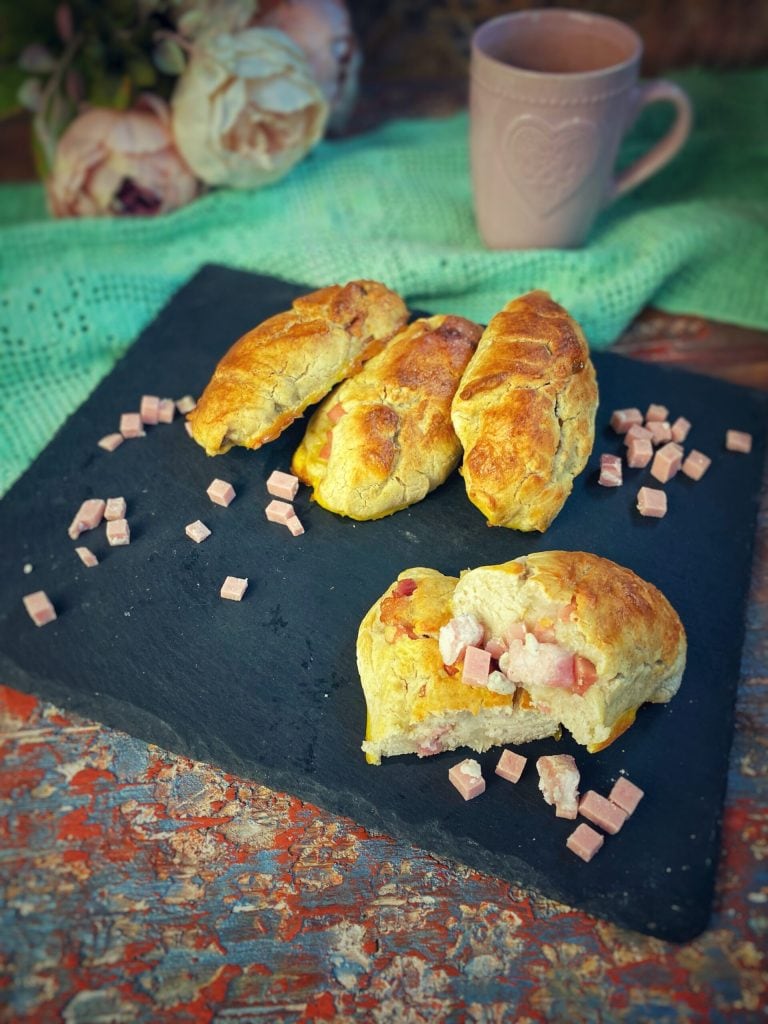 Snijd 12 driehoeken, met de basis naar u toe. Voeg de vulling van gekookte ham en spek (en/of kaas) toe. Vouw de zijkanten en rol op.