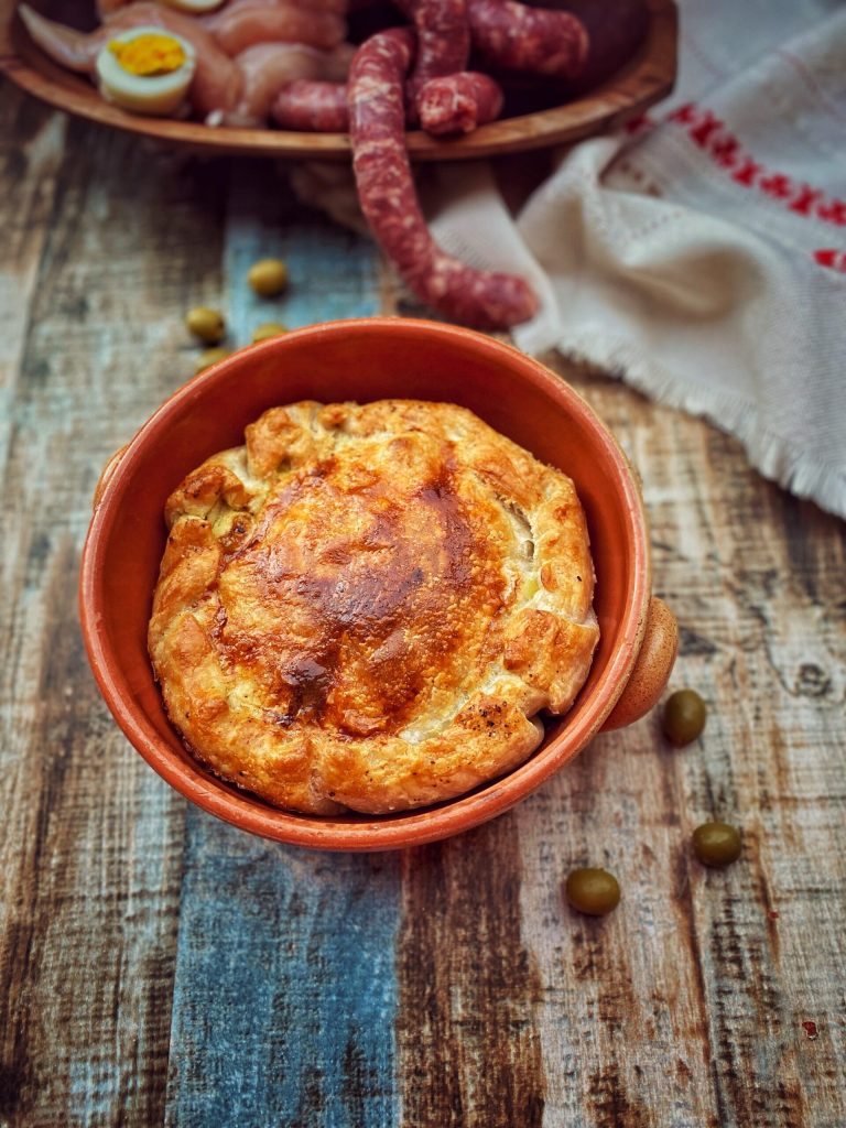 Ook de vulling kan variëren. Het overheersende vlees is kip, meestal de borst, vergezeld van varkenslende en worst.