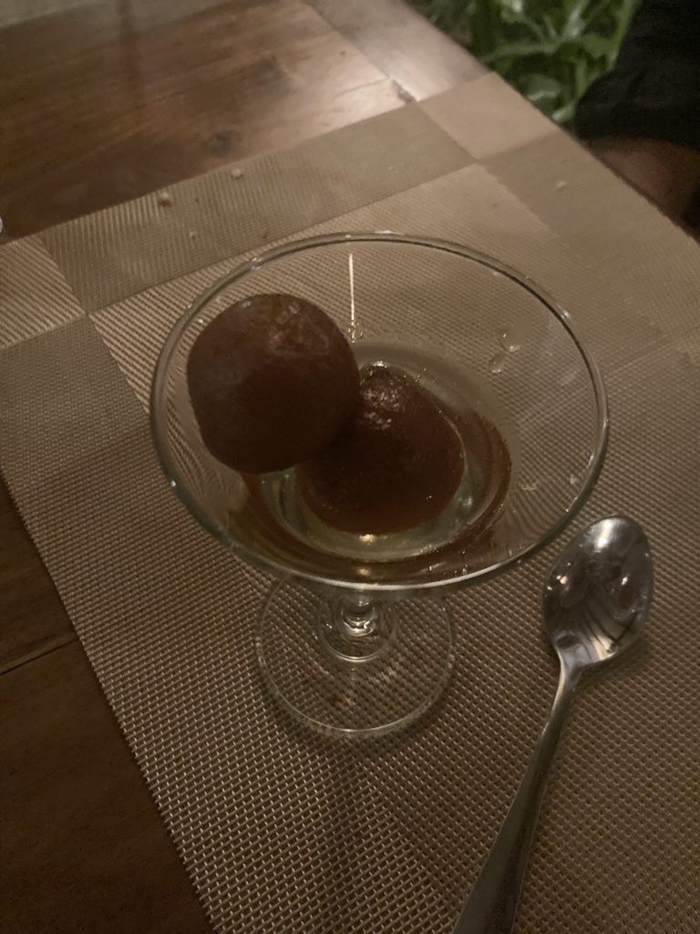 Op de foto de gulab jamun geproefd in het restaurant van het Flamingo Marari Boutique Hotel aan Marari Beach.