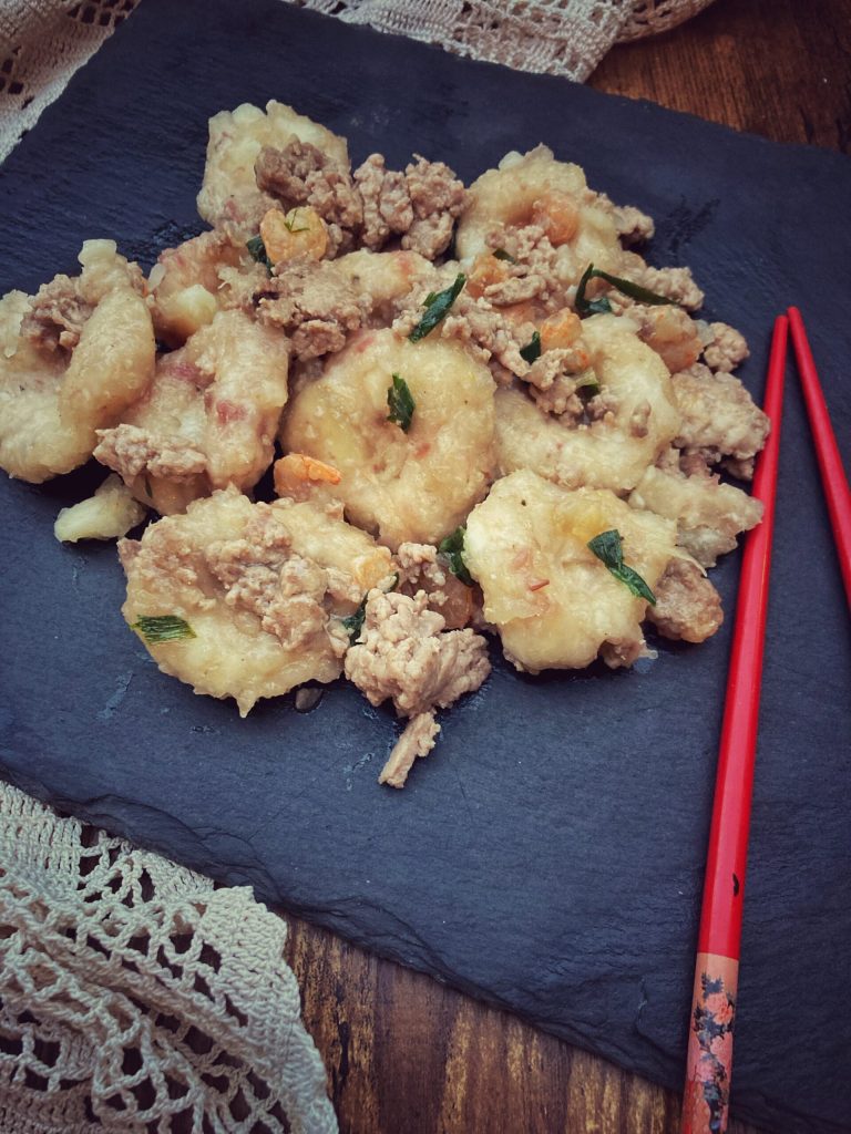 De gnocchi worden gekookt en vervolgens gebakken met gehakt varkensvlees, shiitake, gedroogde garnalen, gedroogde inktvis.