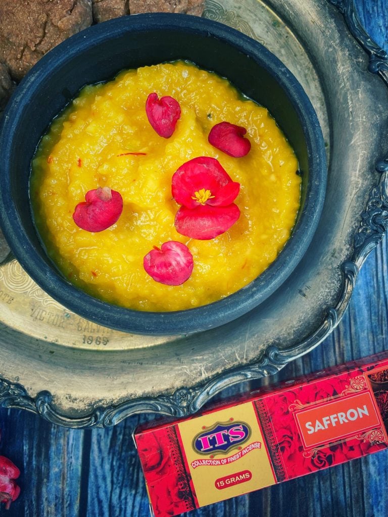Voor het Bloemenmenu de receptversie van Gujarat die gedroogd gemberpoeder (soonth), saffraan en een vleugje ghee bevat, verrijkt met begonia, een eetbare bloem.
