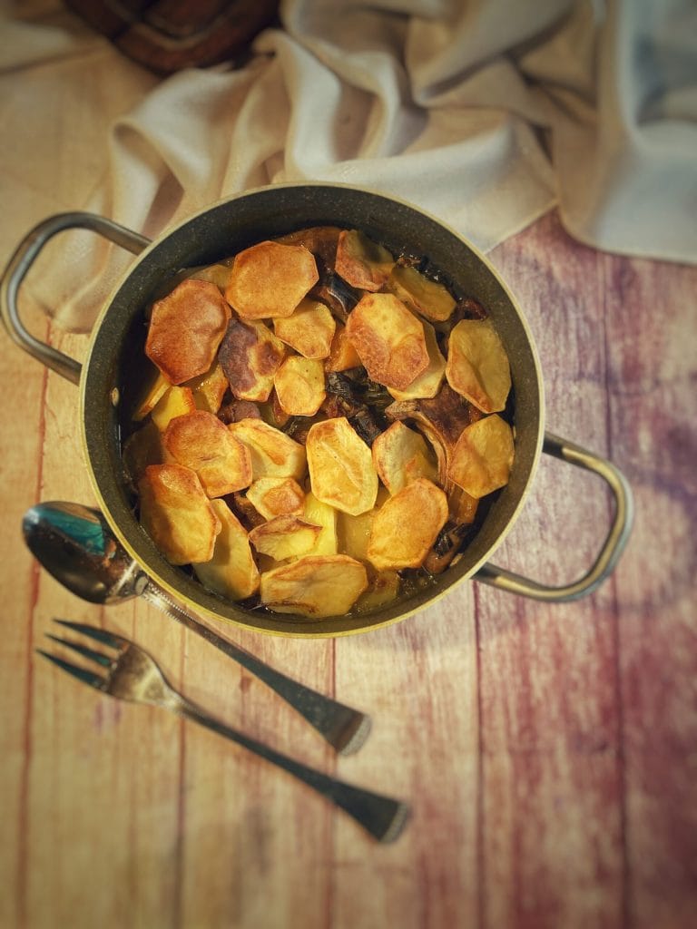 In een ovenschaal of hoge pot, bij voorkeur van keramiek, lagen van lamsvlees en uien afwisselen, samen met de in plakjes gesneden aardappelen, zout en peper. Eindig met de laag aardappelen.
