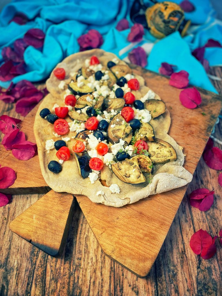 Beleg de pinsa met aubergine, verkruimelde feta en olijven.