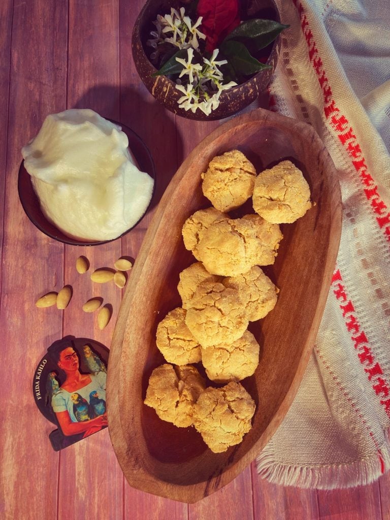Haal het deeg uit de koelkast en verdeel in 25 stukjes waarin een amandel wordt ingesloten, vorm het dan tot een koekje.