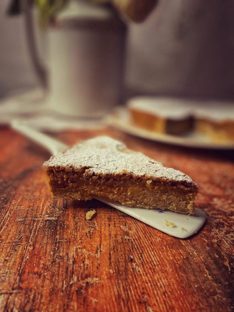 Het is een platte en dichte taart met bloem, boter, suiker en eieren, typisch ongeveer een centimeter hoog en bestoven met poedersuiker, meestal geserveerd als een soort “koffietaart” en niet als een desserttaart.
