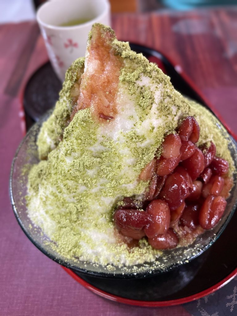 De Okinawa Zenzai is een unieke versie en bevat tsubuan (de azuki bonen pasta die ook gebruikt wordt om dorayaki te vullen in de meest korrelige versie) geserveerd met geschaafd ijs en tómochi.