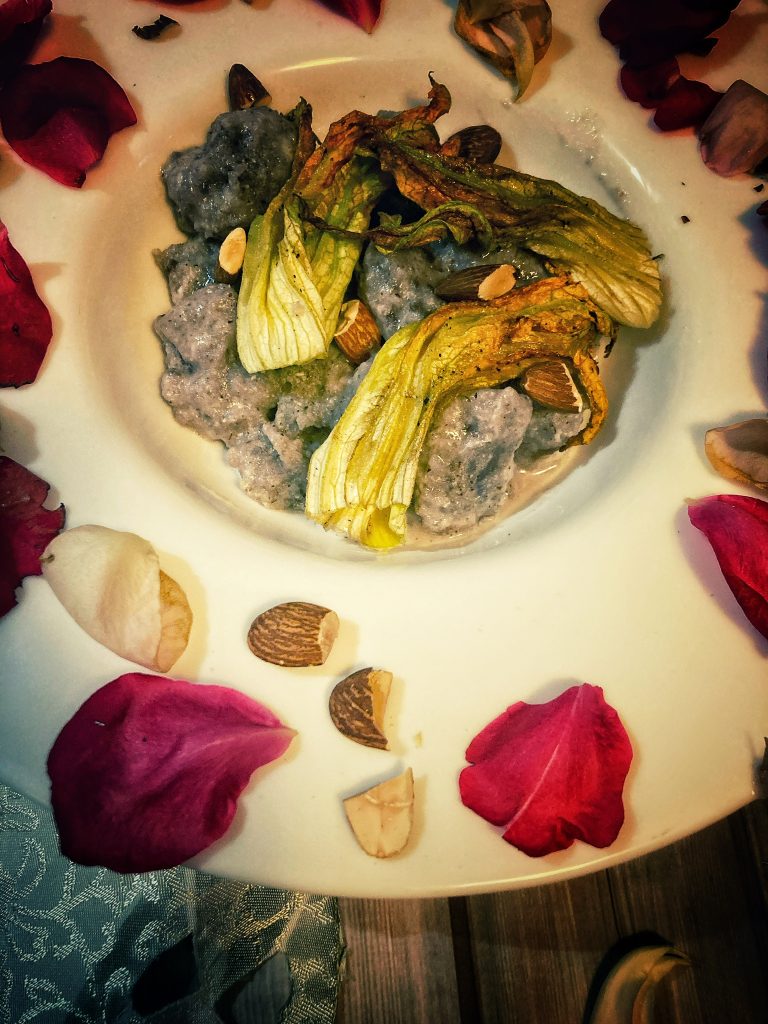 Dien op met de gnocchi, voeg de pecorinocrème toe, en garneer met courgettebloemen en geroosterde amandelen.