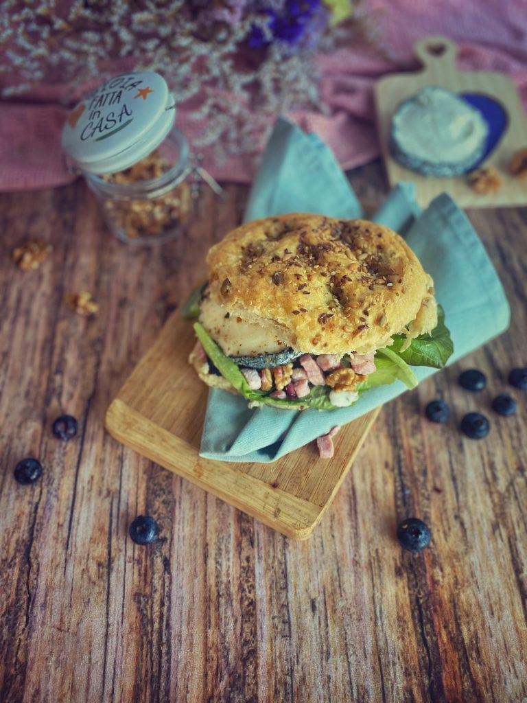 Ik heb walnoten, bosbessen, honing en spek toegevoegd, alles verpakt in een focaccia van haver met gemengde zaden.
