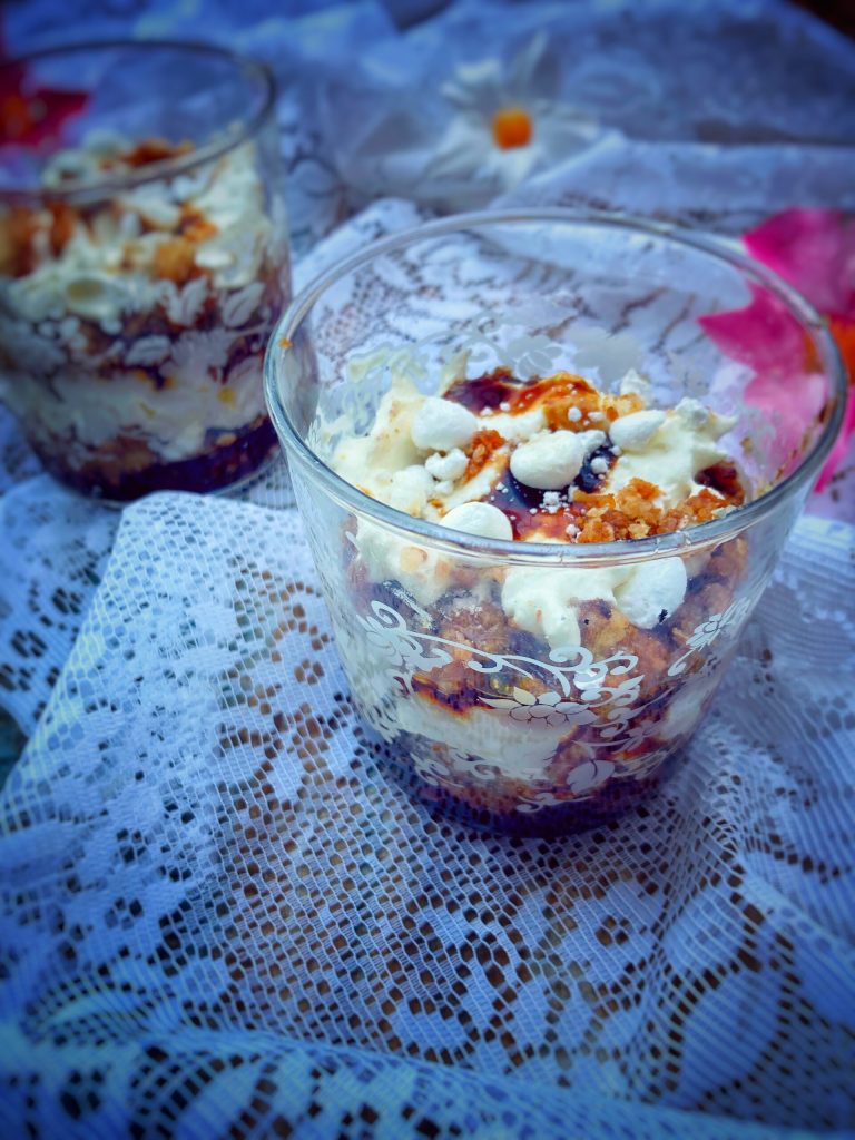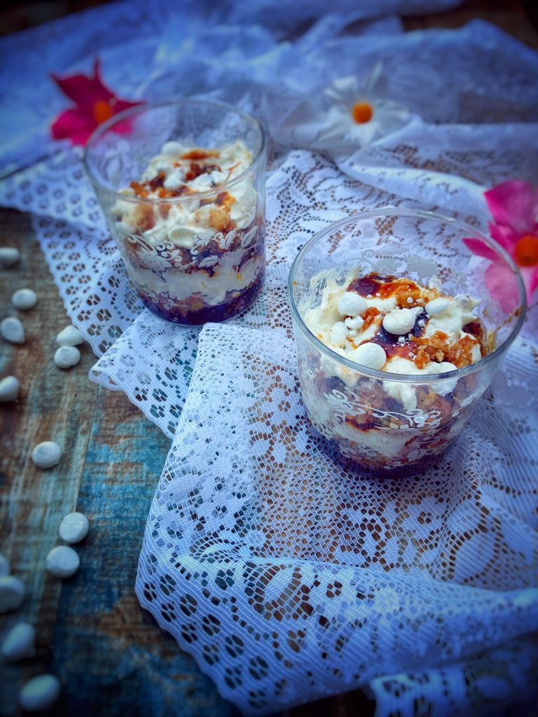 Stel in elk glas de lagen samen met: koekjesbodem + dulce de leche + meringue + slagroom, in dubbele laag, en decoreer met meringue en verkruimelde koekjes.