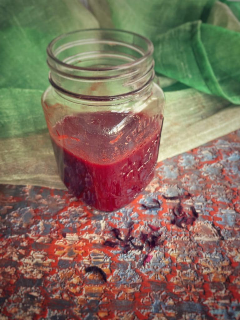 Mijn versie van BBQ-saus met hibiscus bevat: tomatenpulp, azijn, ahornsiroop, chili, pittige paprika, gember, zout en peper en natuurlijk de hibiscusbloemen.