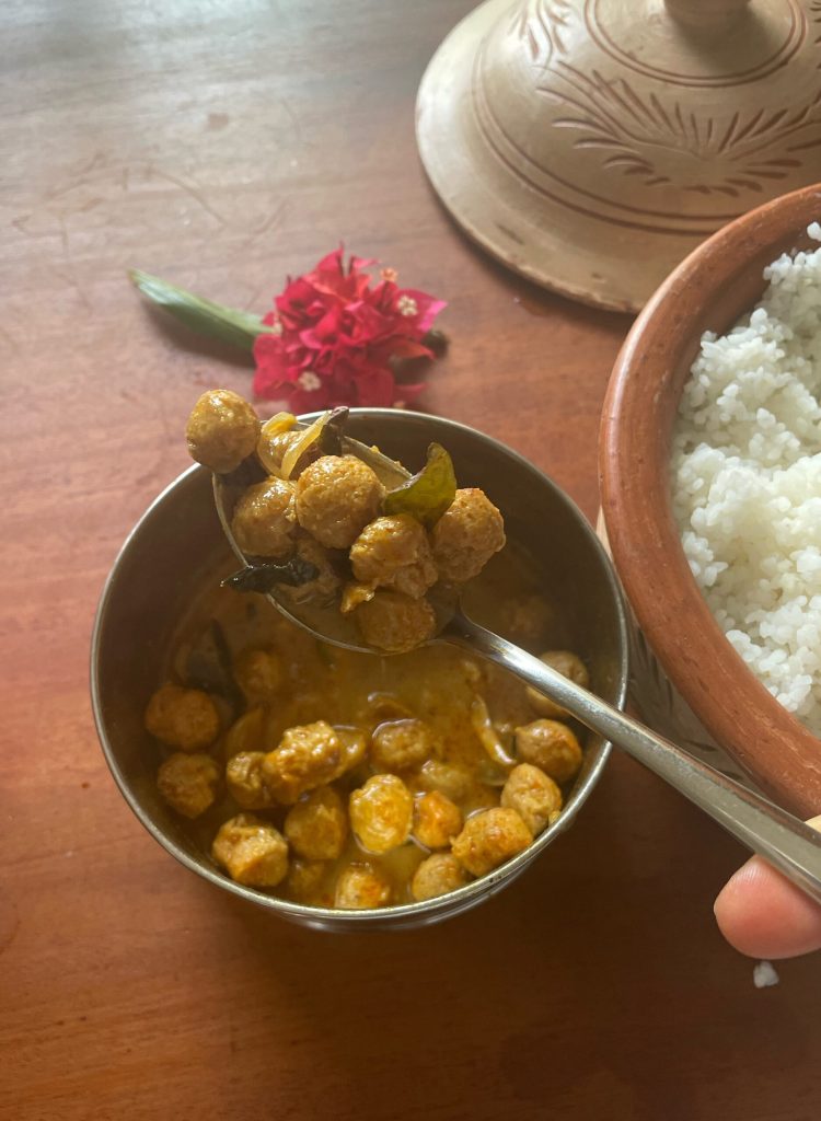 De balletjes of stukjes die je ziet zijn gedehydrateerde sojaproteïnen (TVP – textured vegetable protein), gehydrateerd in warm water en vervolgens gekookt in een rijke kokos- en kruidencurry.
