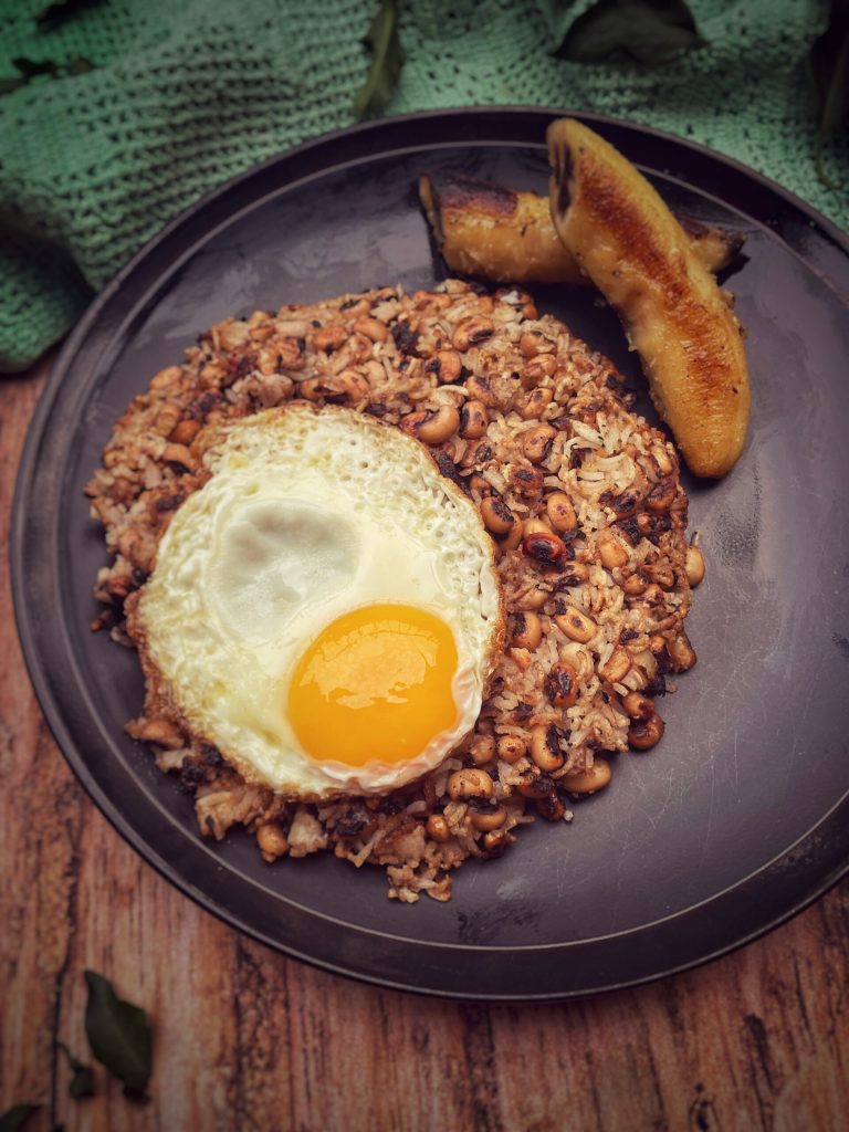 Serveer warm met gebakken ei en gebakken bakbanaan.