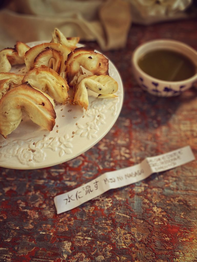 Deze Japanse koekjes zijn “gelukskoekjes” die zachter, groter zijn en het briefje is niet binnenin, maar in een vouw geplaatst, en bevatten sesam en miso in het deeg, zonder vanille of vet en waarschijnlijk met joshinko, oftewel Japanse rijstmeel.