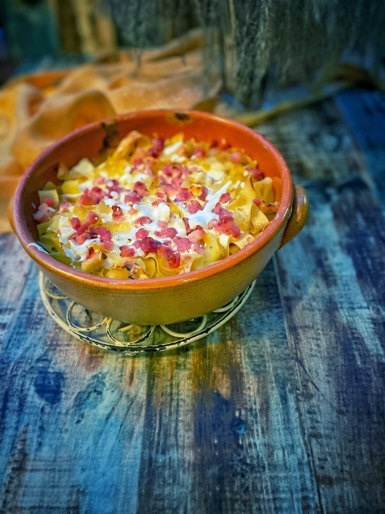 Je kunt meerdere lagen maken, maar plaats bovenop een portie pasta en het knapperige spek (szalonna).