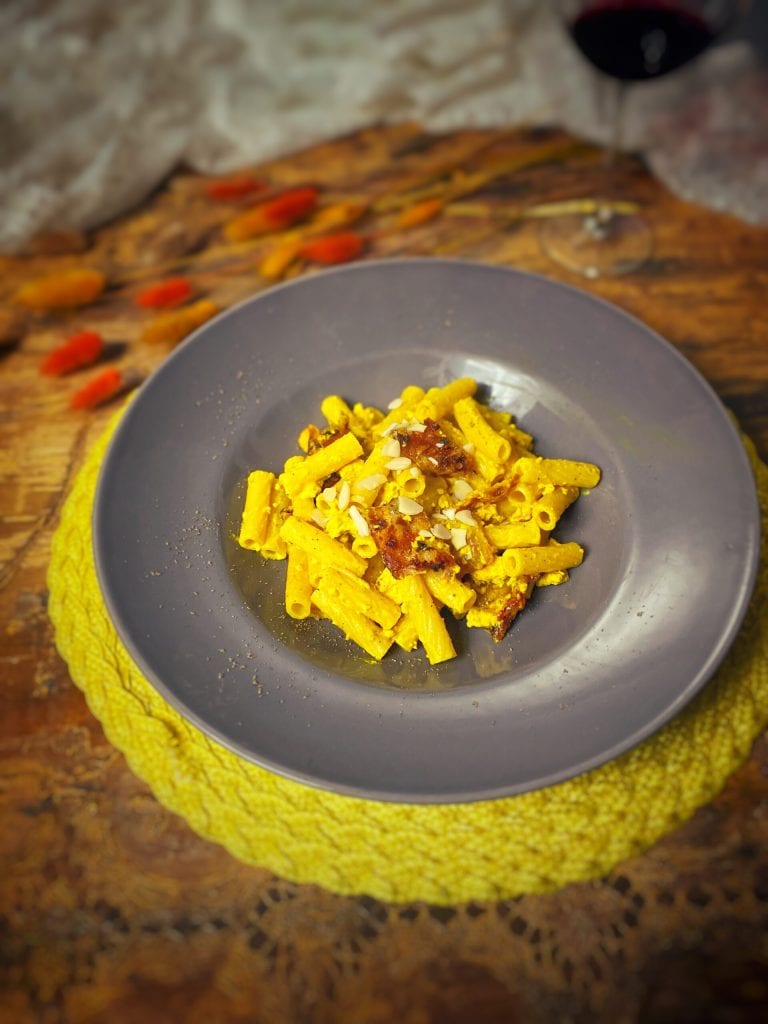De tofu gecombineerd met kurkuma en plantaardige room creëert de typische “eicrème” van de carbonara.