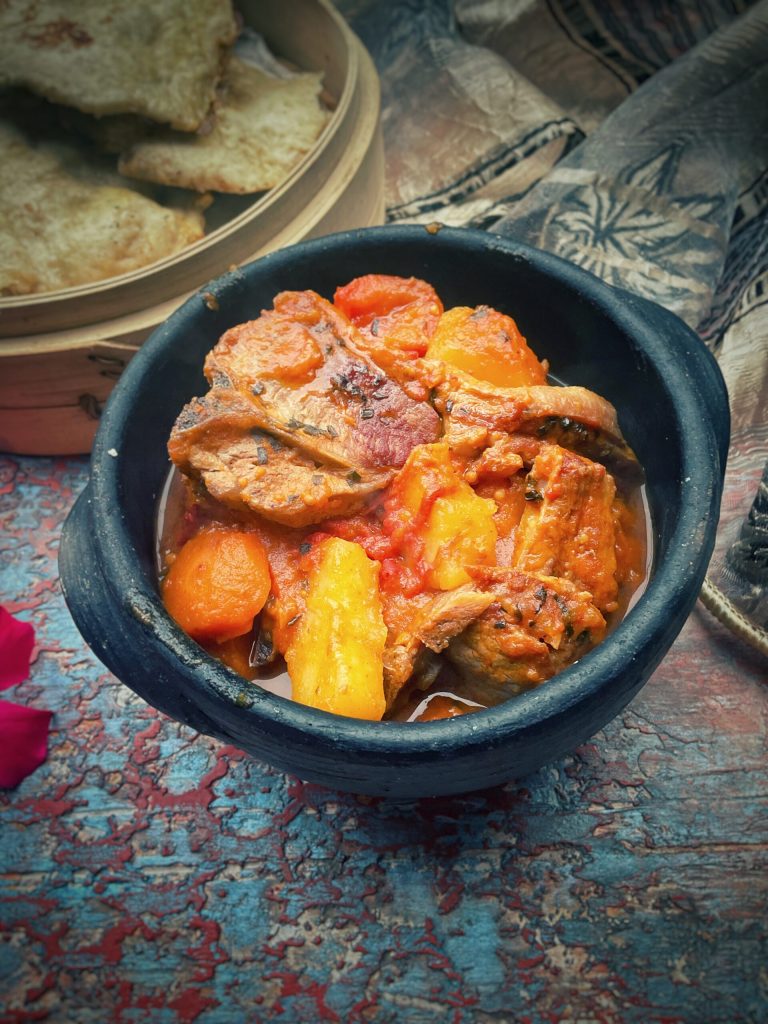 Het is een rijke en smaakvolle lamstoofpot, gekookt met groenten en geserveerd met naanbrood.