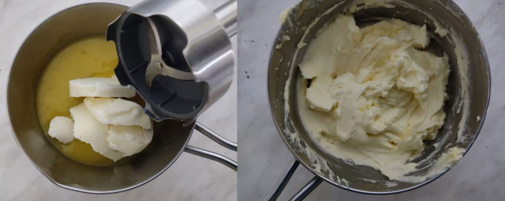 Giet daarna de room in een kom, bedek met huishoudfolie en laat afkoelen in de koelkast, als het koud is voeg je de boter toe en bereid je een emulsie door te werken met een staafmixer.