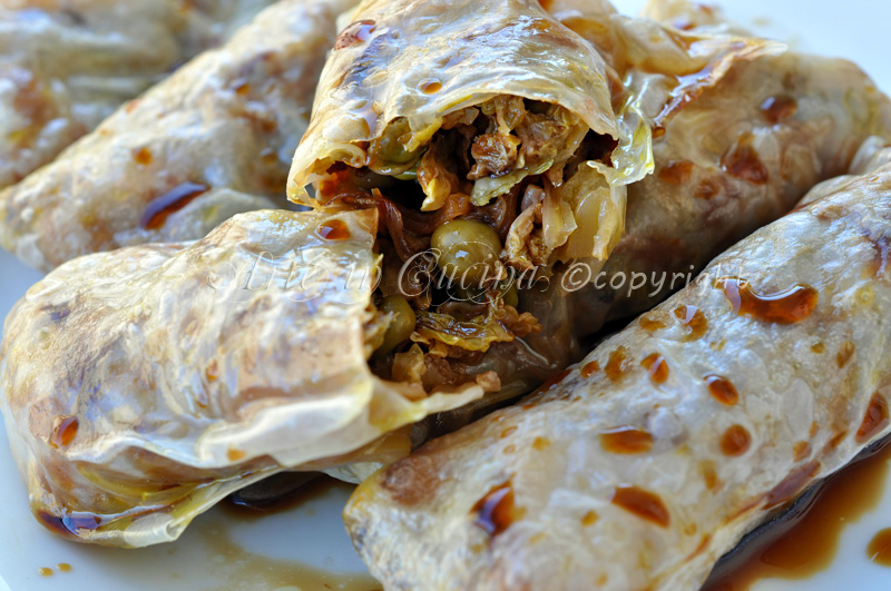 • Leg 3 vellen filodeeg op het werkblad en snijd ze in 4 delen, als je rijstvellen gebruikt, volg dan de instructies op de verpakking, ze moeten snel worden bevochtigd en afgetapt.