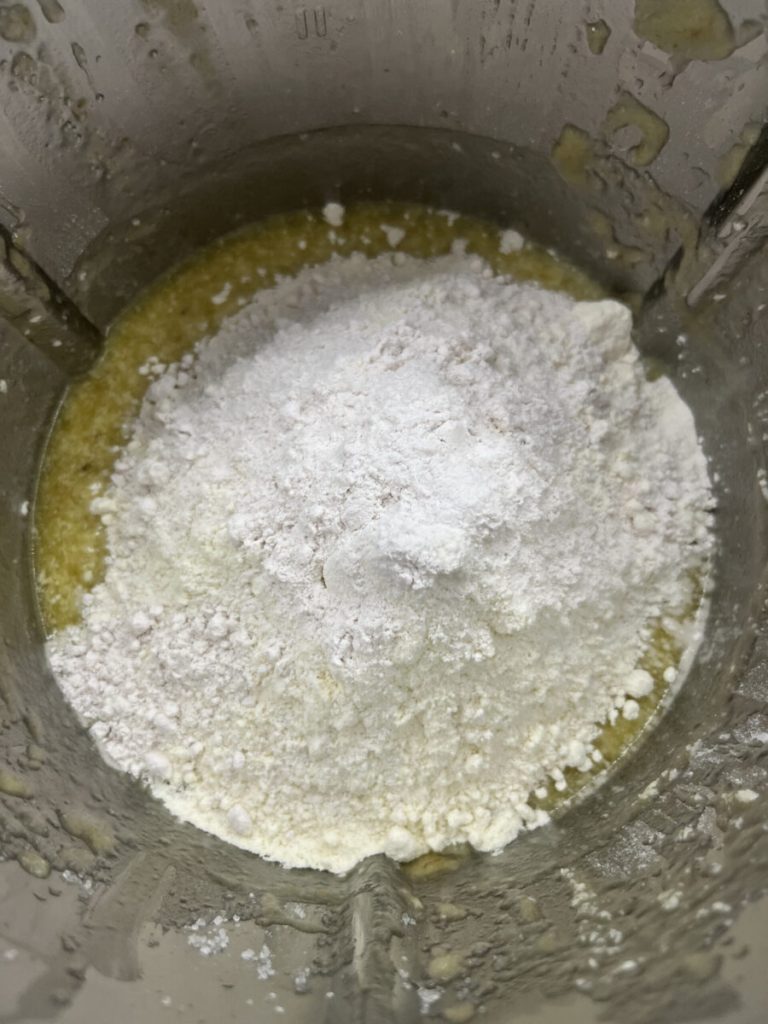 Adicione a manteiga amolecida em pedaços e o açúcar, depois ligue o liquidificador.