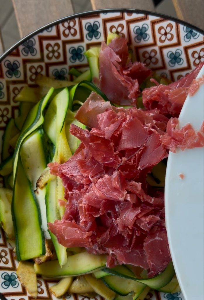 As abobrinhas, protagonistas da estação e facilmente encontradas no mercado a preços acessíveis, são leves e ricas em fibras. Se você quiser descobrir os valores nutricionais, aqui está o link que recomendo. Combinadas com bresaola, uma fonte de proteína magra, e temperadas com azeite extravirgem e suco de limão, oferecem um toque fresco, detox e nutritivo.