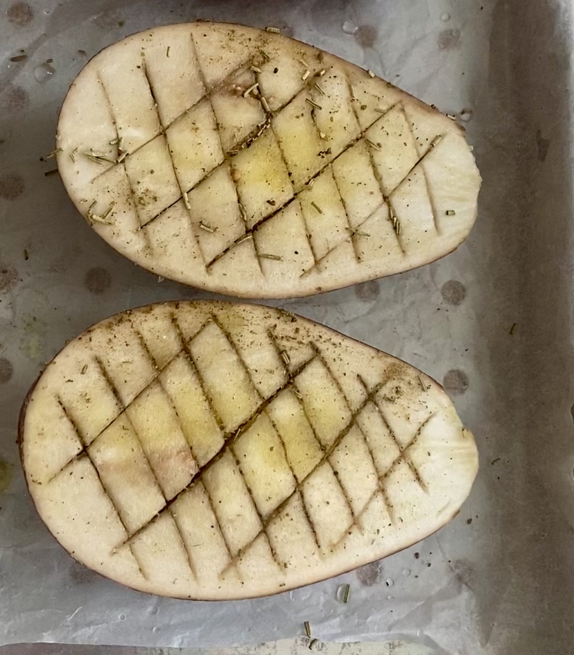 Lave bem as berinjelas e corte-as ao meio no sentido do comprimento. Faça cortes como na foto e tempere com sal, ervas aromáticas e um fio de óleo.