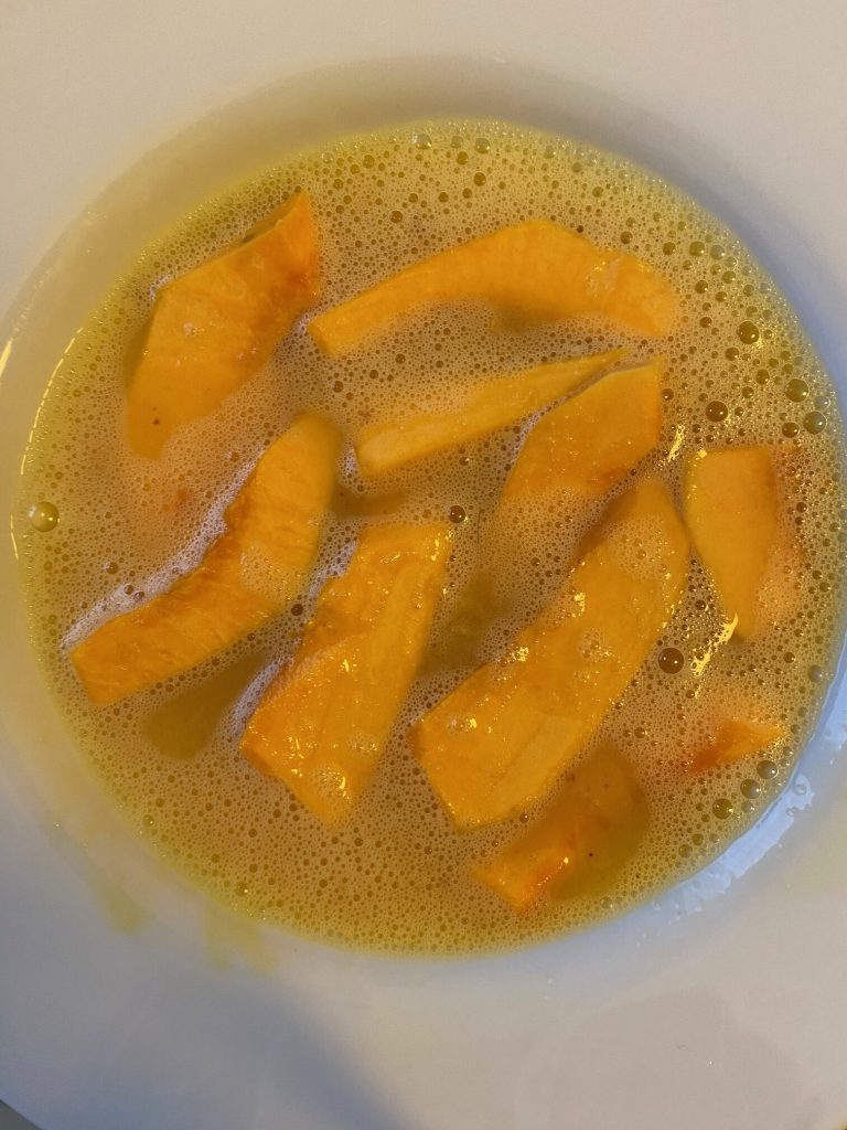 Em um prato, bata os ovos, tempere com sal e adicione a páprica ou a pimenta, passe as fatias de abóbora nos ovos.
