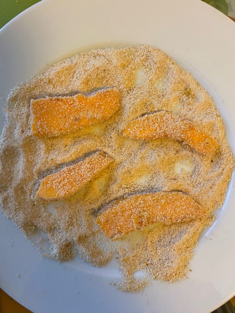 Passe as fatias de abóbora na farinha de rosca e asse no forno a 200° graus por 40 minutos ou até dourar, virando na metade do tempo.