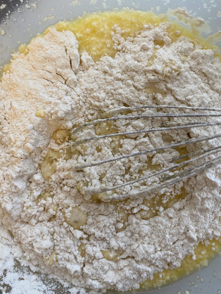 Ao composto, adicione a farinha e a fécula e comece a misturar.